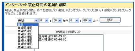 ページの表示を禁止する時間帯を設定します。ある時間帯だけインターネット利用を許可したり、禁止したりできます。インターネットに没頭しすぎて困ってる、などの場合にご活用ください。 |